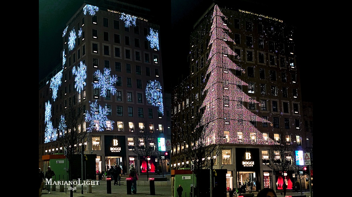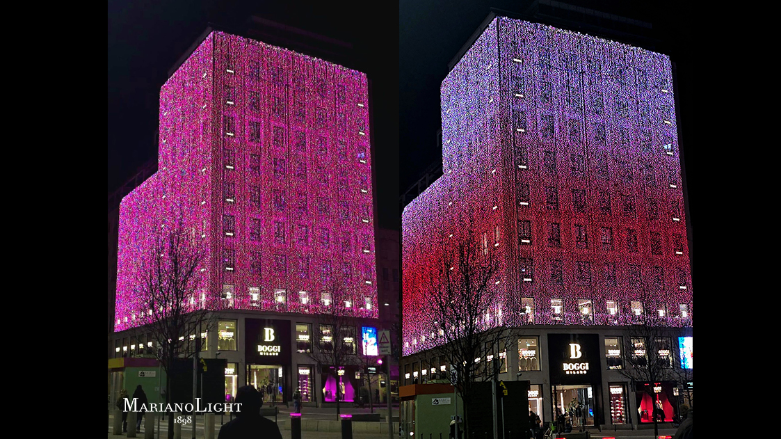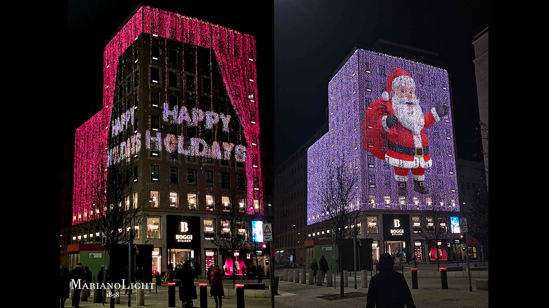 During the 2025/2026 Christmas season, MarianoLight oversaw the decoration of numerous shops and businesses, giving charm and identity to their façades. In the heart of Milan, in Piazza San Babila, the Boggi fashion house—an emblem of style in the cityscape—becomes the stage for a luminous installation that conveys the magic of Christmas through images, movement, and color. The entire façade was covered with more than 52,000 RGB LED lights, creating a glowing “skin” that interacts with the building’s architecture, enhances its lines, and envelops the city in a warm, welcoming atmosphere filled with festive charm. This luminous gesture transforms the building into a symbol of celebration, emotion, and wonder in the heart of Milan.